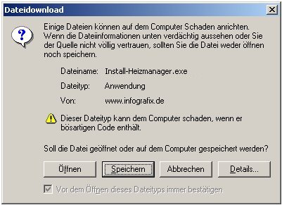 Sie können sich hier eine Demoversion des beschriebenen Programms herunterladen. Diese Datei "Install-Heizmanager.EXE" ist eine selbsextrahierende ZIP-Programmdatei. Beim Betätigen der Taste "Download" werden sie folgende Meldung sehen: