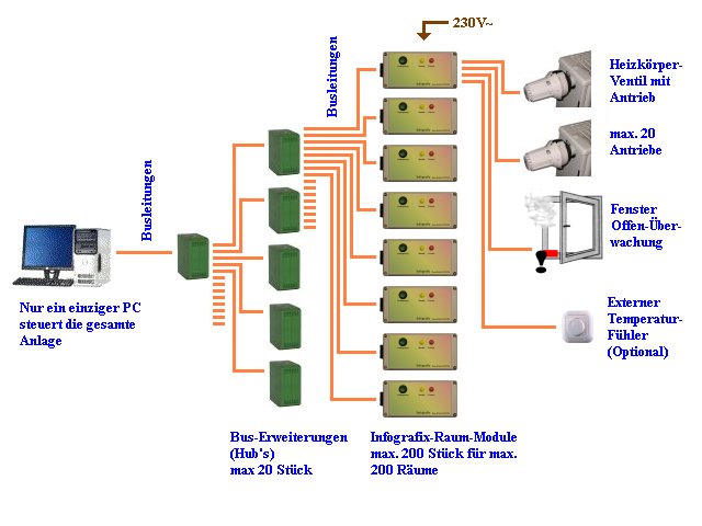 Bei dem PC wird zur gesamten Kontrolle der Anlage nur der LPT-Port (Drucker-Anschluss) verwendet. Die Leitungslänge zwischen den Bus-Erweiterungen (Hub's) beträgt max 100 Meter. Somit können auch große Gebäude ohne Probleme verkabelt werden. Das letzte Glied im Bus ist das Infografix-Raum-Modul. Diese Einheit holt die Raumtemperatur, gibt die Signale des PC an die Ventil-Antriebe bei den Heizkörpern weiter und holt Informationen über offene Fenster. Ein Drucktaster erlaubt je nach Konfiguration die sofortige Abschaltung oder eine gewünschte Verlängerung der Raumheizung.